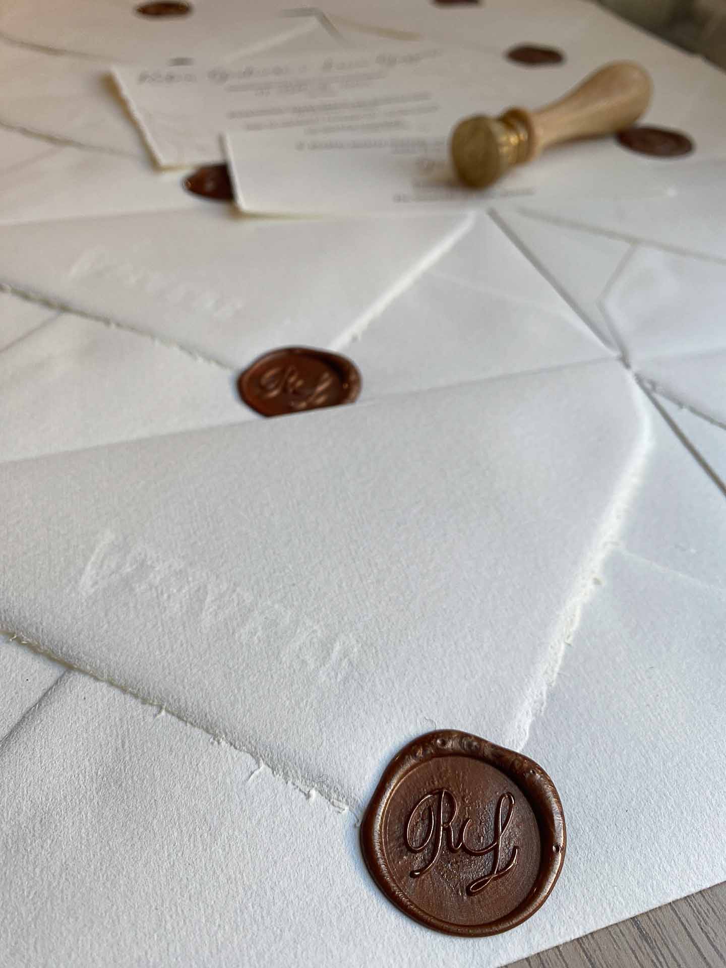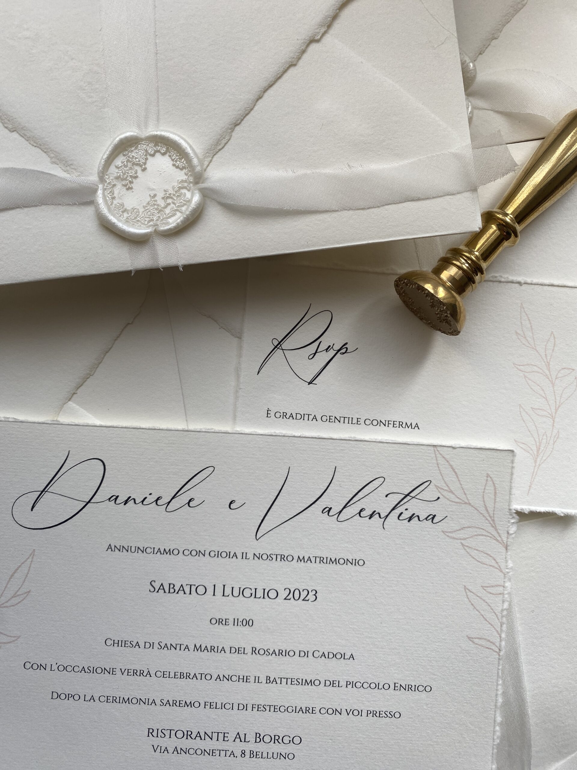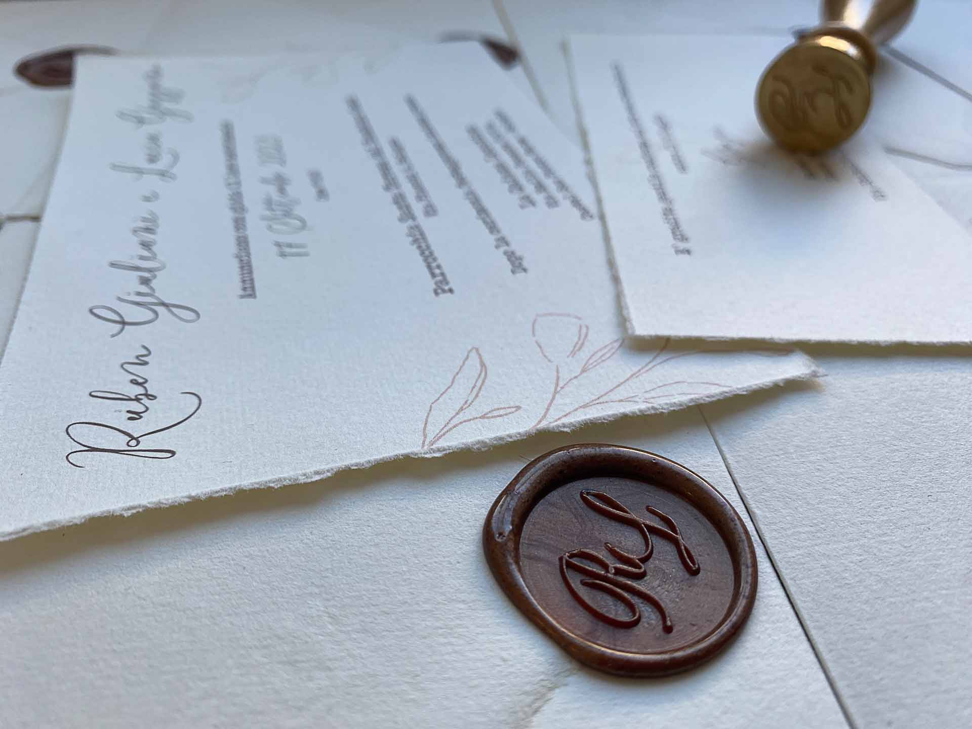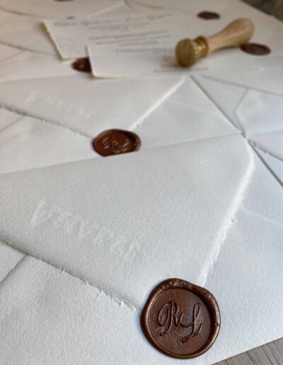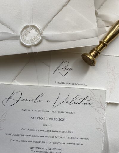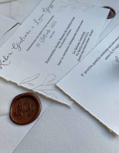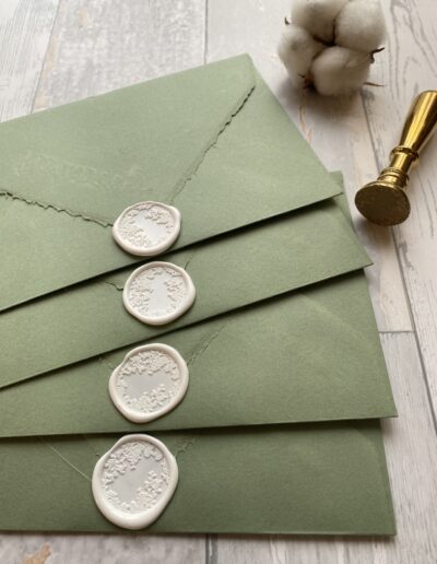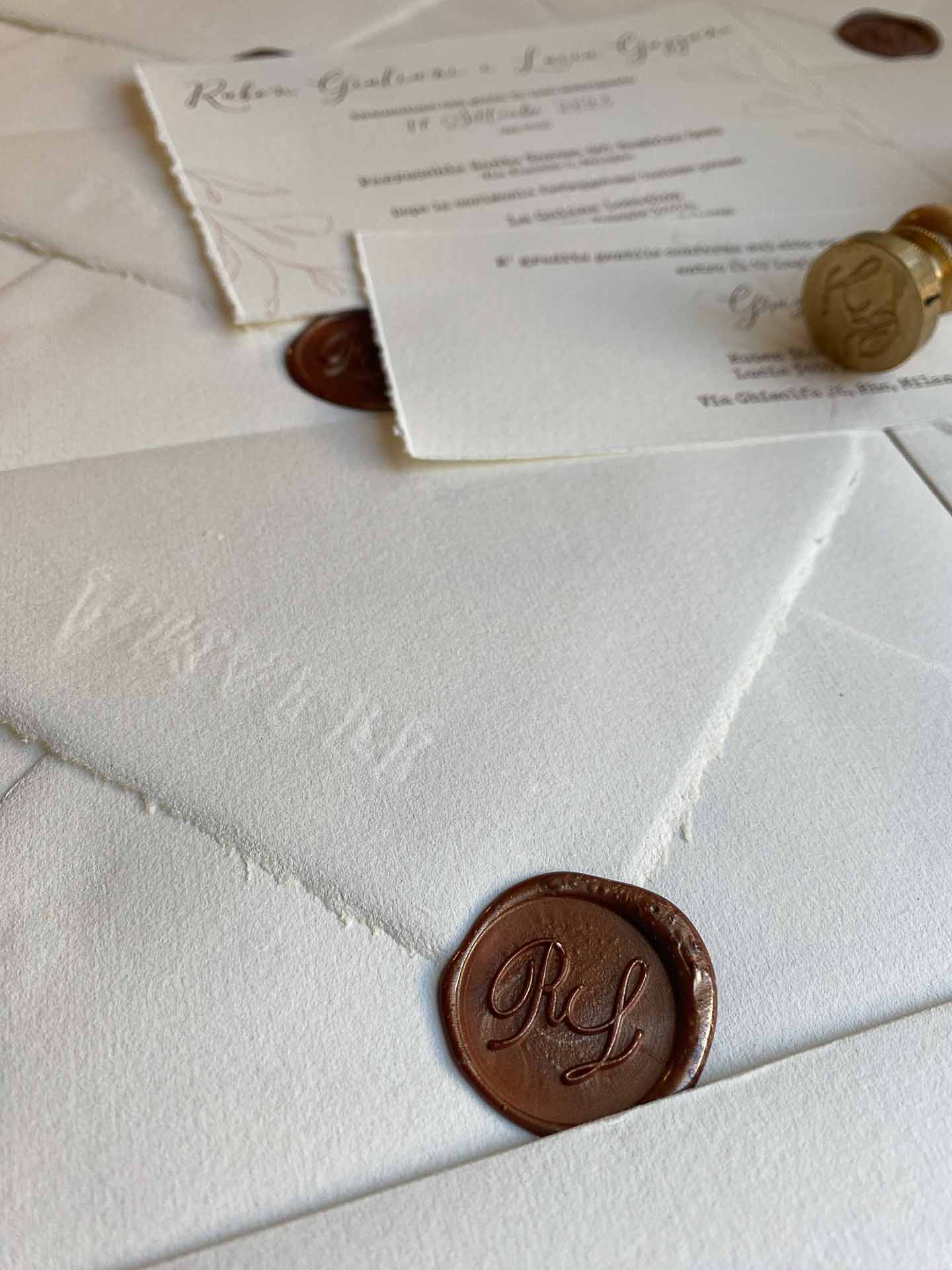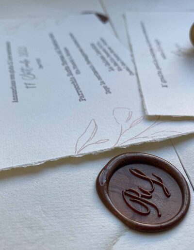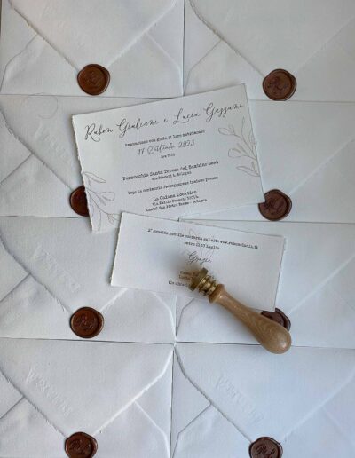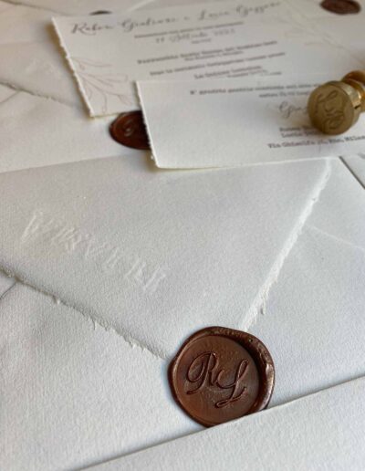 - Sigillo in Cera: Un elegante sigillo in cera bianca, applicato sull’angolo superiore destro della busta, aggiunge un tocco di raffinatezza e personalizzazione. Il sigillo può essere personalizzato con le iniziali degli sposi o con un motivo a loro scelta.