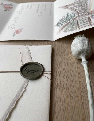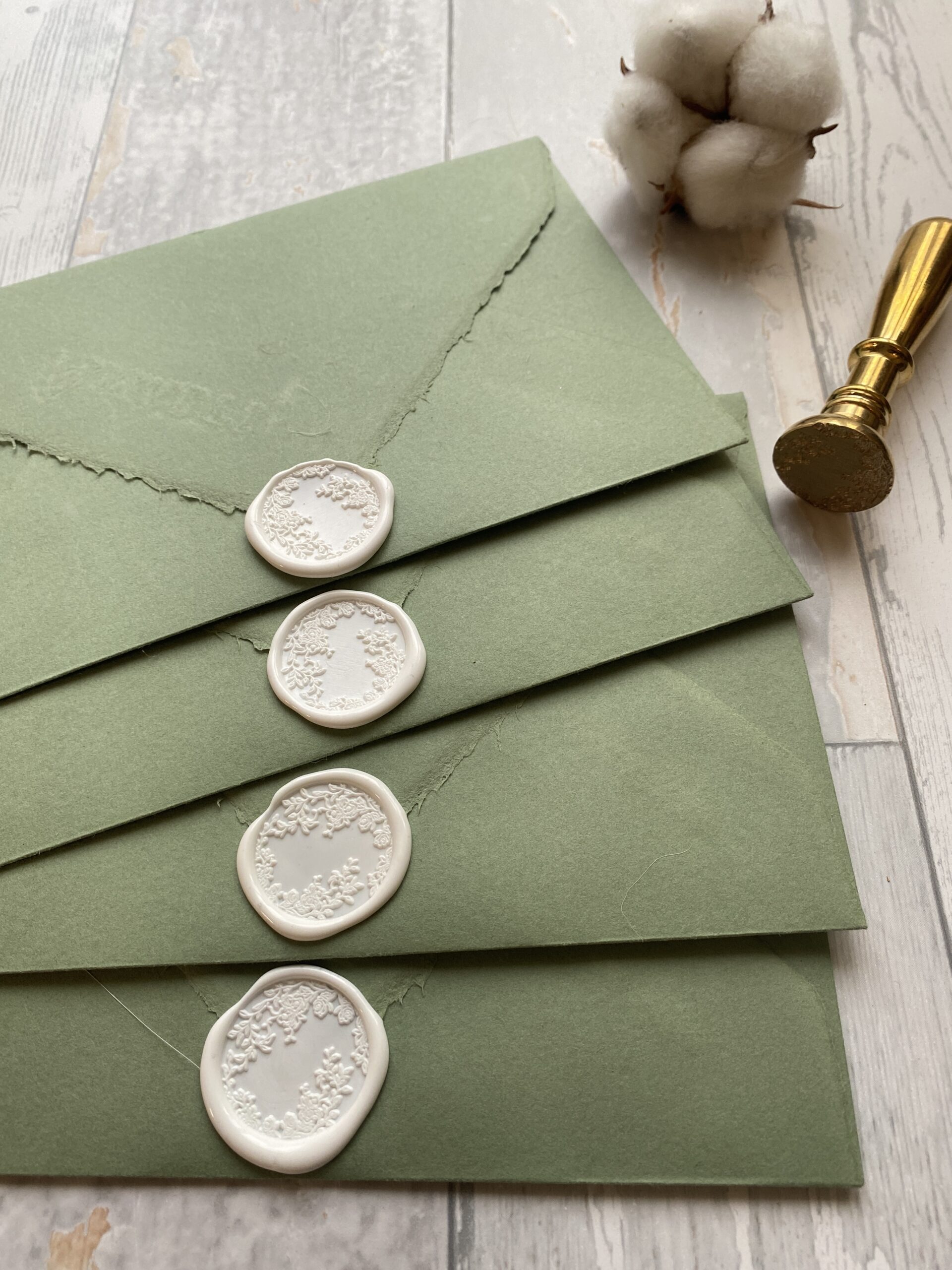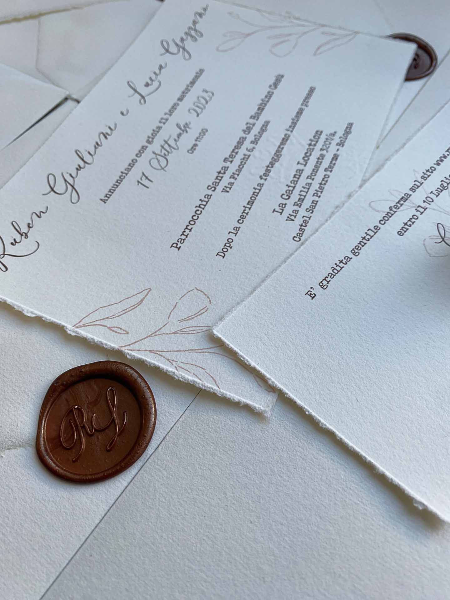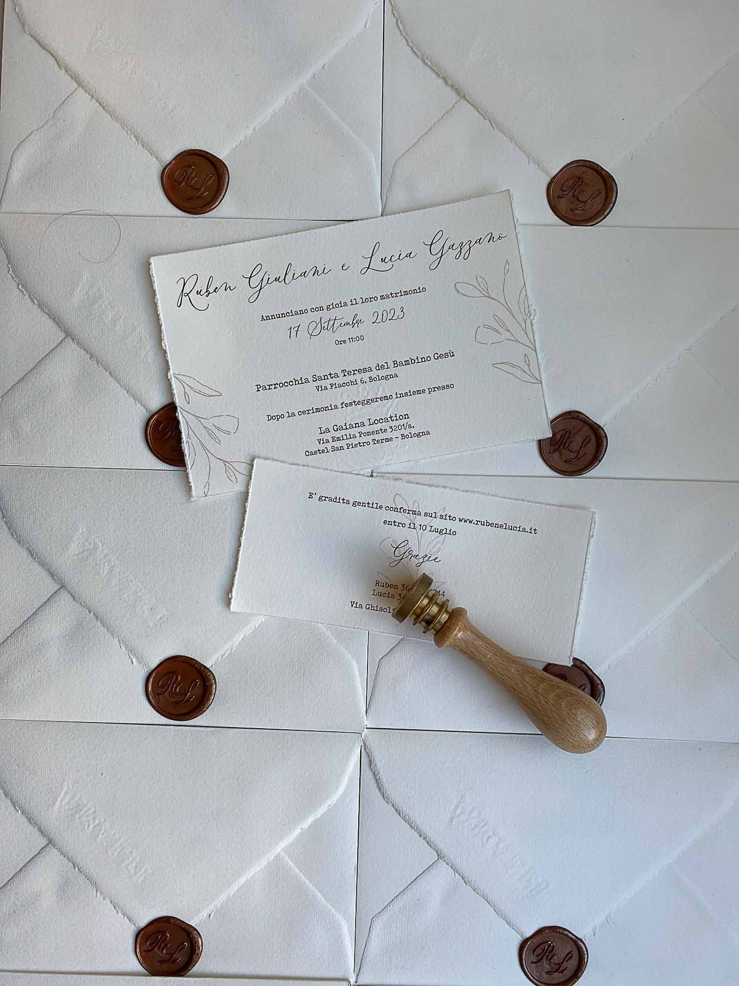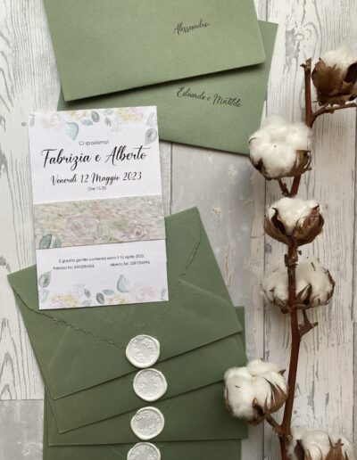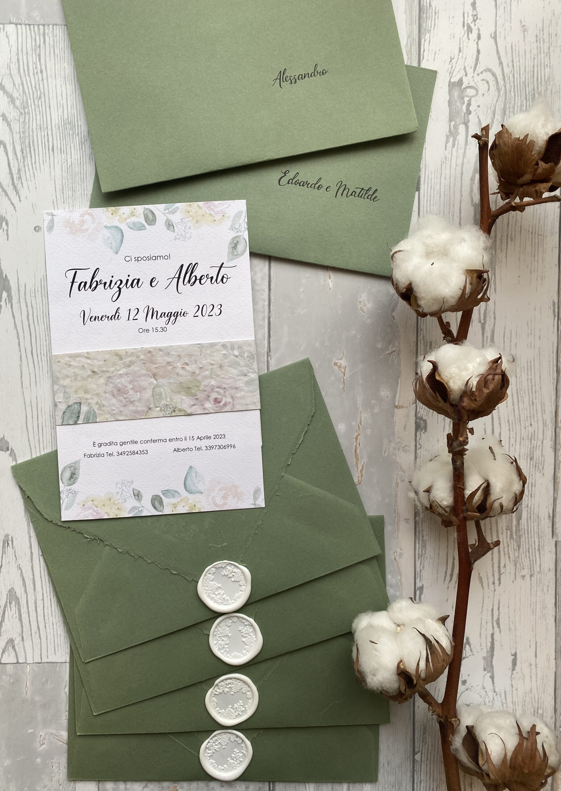 - Sigillo in Cera: Un elegante sigillo in cera bianca, applicato sull’angolo superiore destro della busta, aggiunge un tocco di raffinatezza e personalizzazione. Il sigillo può essere personalizzato con le iniziali degli sposi o con un motivo a loro scelta.